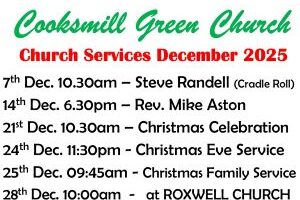 Cooksmill Green Congregational Church December 2025 Sunday 7th 10.30 a.m. Steve RandellSunday 7th December – 10.30 a.m. Cradle Roll Service Sunday 14th 6.30 p.m. Rev Mike Aston Sunday 21st 10.30 a.m. Christmas Celebration Service Wednesday 24th 11.30 p.m. Christmas Eve Thursday 25th 9.45 a.m. Steve RandellThursday 25th December – 9.45 a.m. Christmas Morning Family Service Sunday 28th 10.00 a.m. ROXWELL CHURCHSunday 28th December – 10.00 a.m. United Service at Roxwell Church More